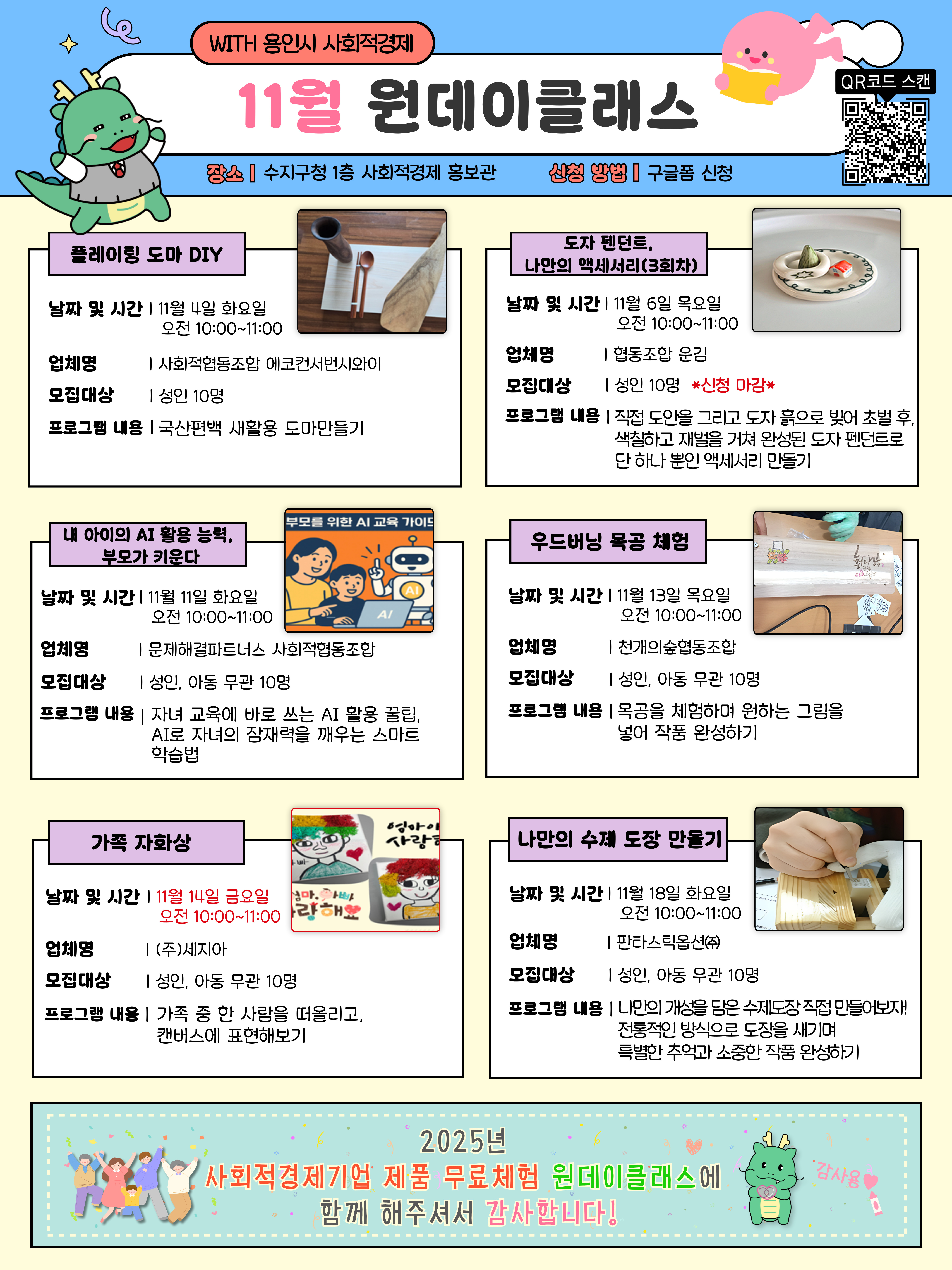 [사회적경제기업 제품 무료 체험, 원데이클래스 11월 프로그램 참가 신청]