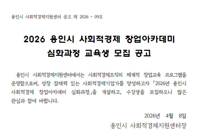 2026 용인시 사회적경제 창업아카데미 심화과정 교육생 모집공고(~4. 20.(월))