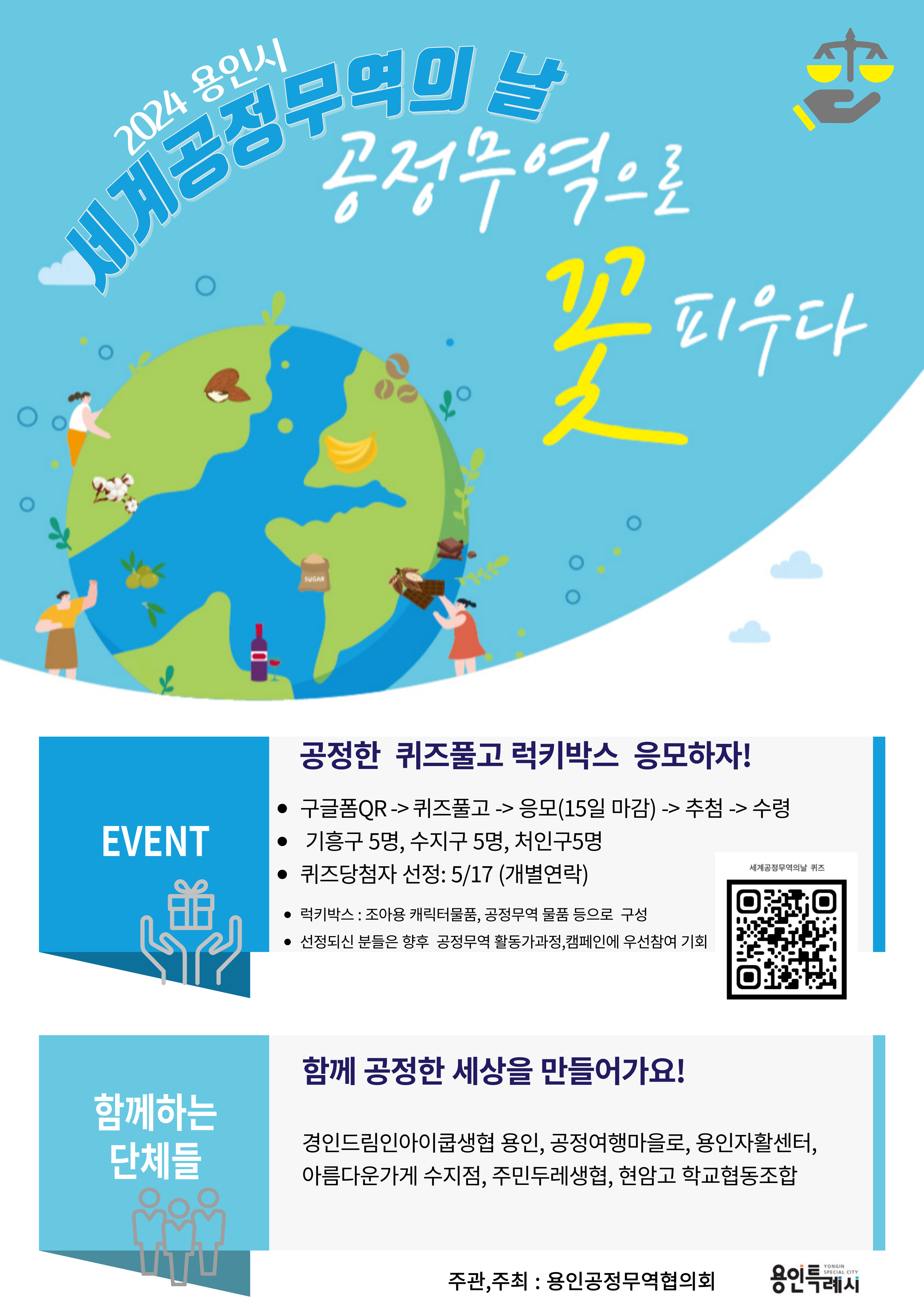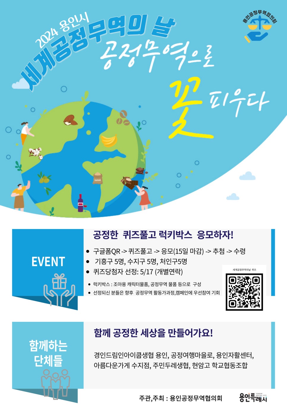 용인공정무역협의회:경인드림인아이쿱생협 용인, 공정여행마을로, 용인자활센터, 아름다운가게 수지점, 주민두레생협, 현암고 학교협동조합