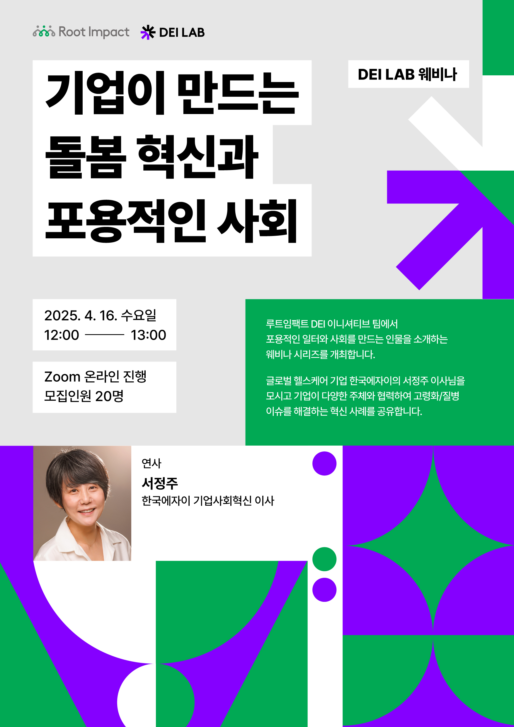 루트임팩트 DEI 이니셔티브 팀에서 포용적인 일터를 만드는 인물과 조직을 소개하는 웨비나 시리즈를 개최합니다.