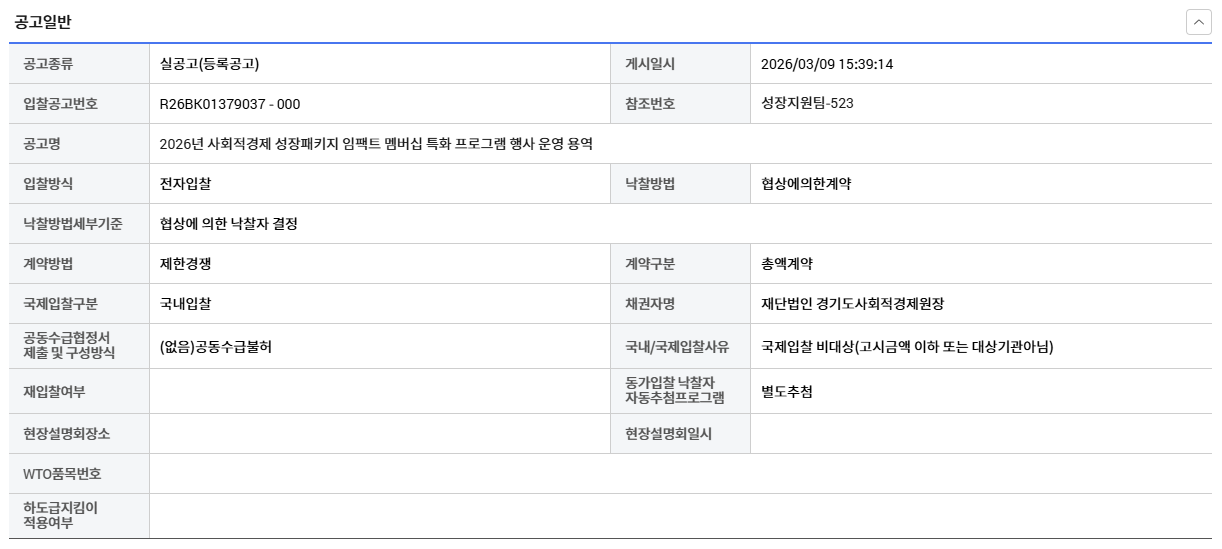 (입찰공고문) 2026년 사회적경제 성장패키지 임팩트 멤버십 특화 프로그램 행사 운영 용역.pdf (267.3 KB)