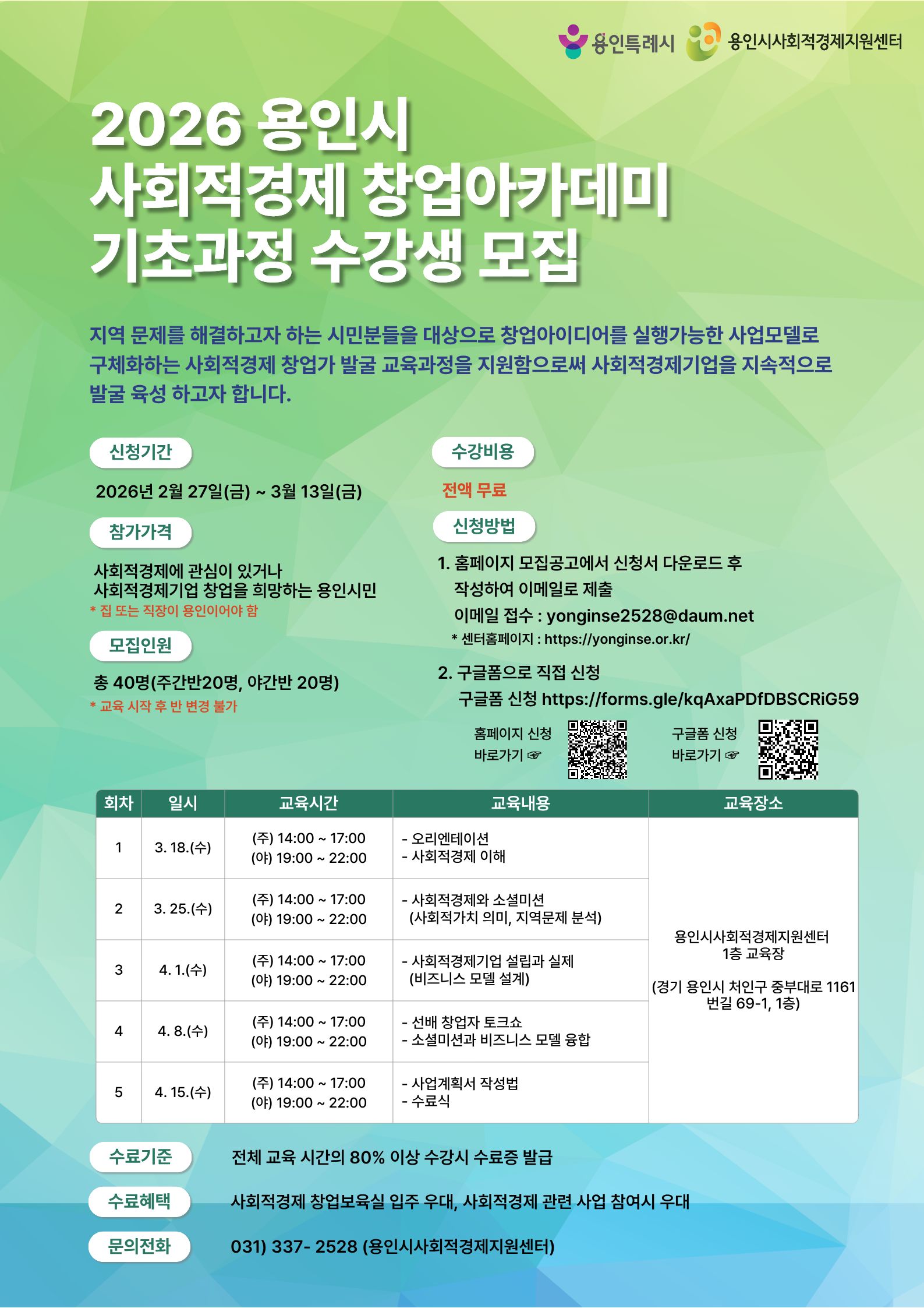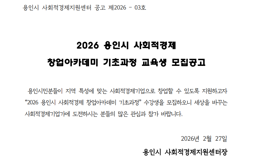 2026 용인시 사회적경제 창업아카데미 기초과정 교육생 모집공고(~3. 13.(금))