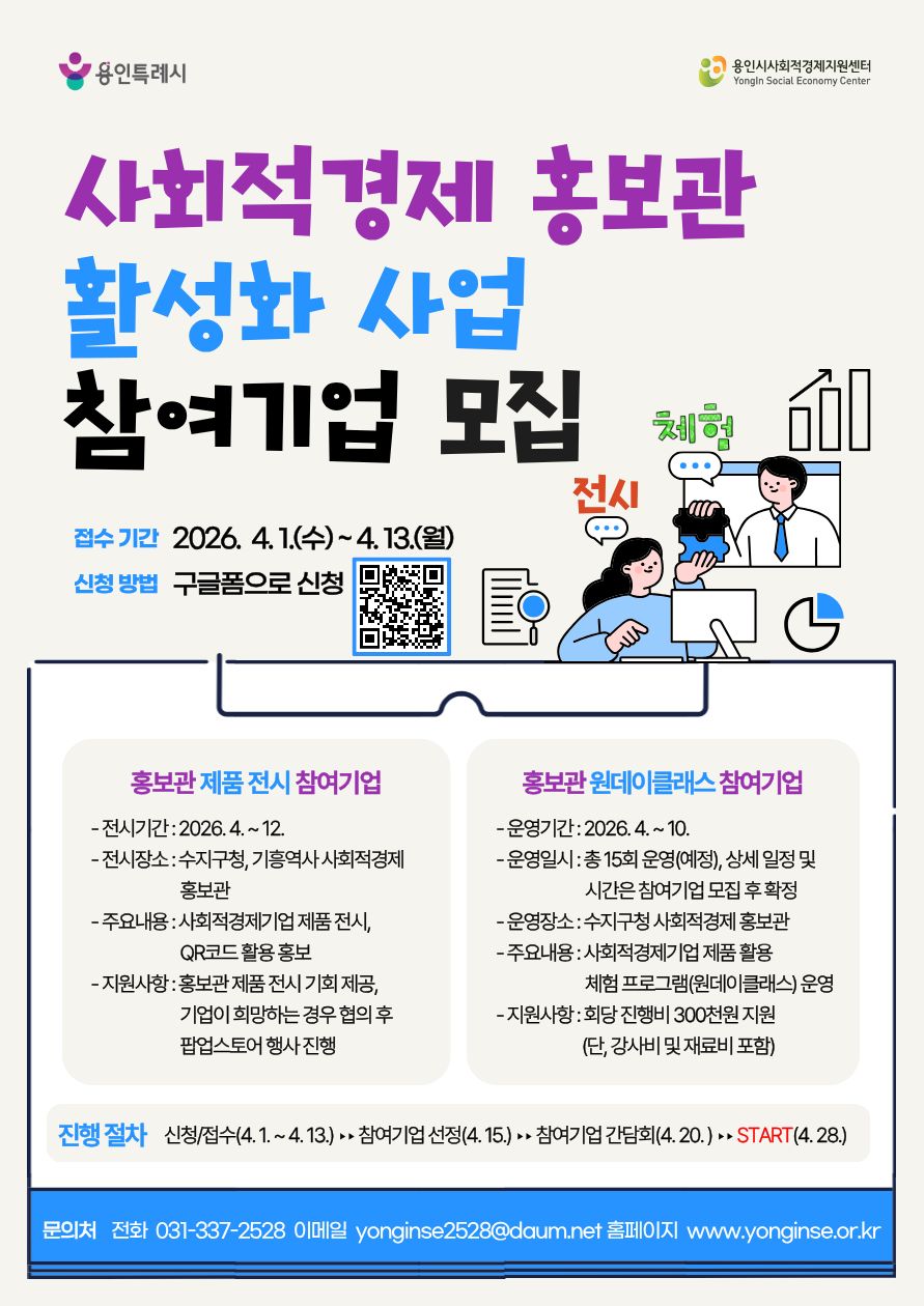 용인시 사회적경제지원센터에서는 사회적경제기업 제품 홍보 및 시민 참여형 체험 프로그램 운영을 통해 사회적경제 인식 확산 및 판로 확대를 지원하고자 「2026년 용인시 사회적경제 홍보관 활성화 사업」 참여기업을 다음과 같이 모집하오니 많은 관심과 참여 바랍니다.