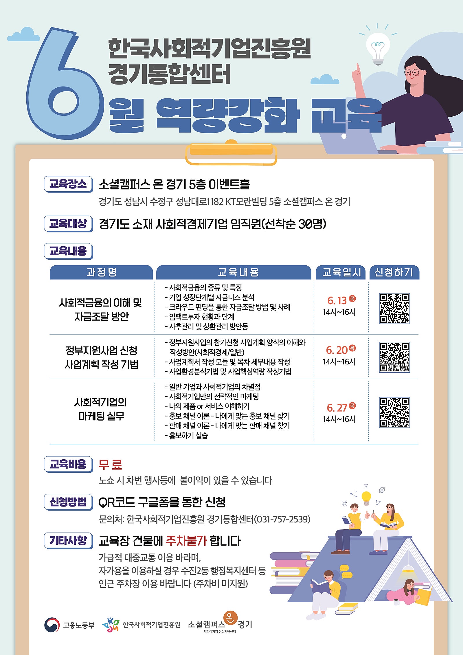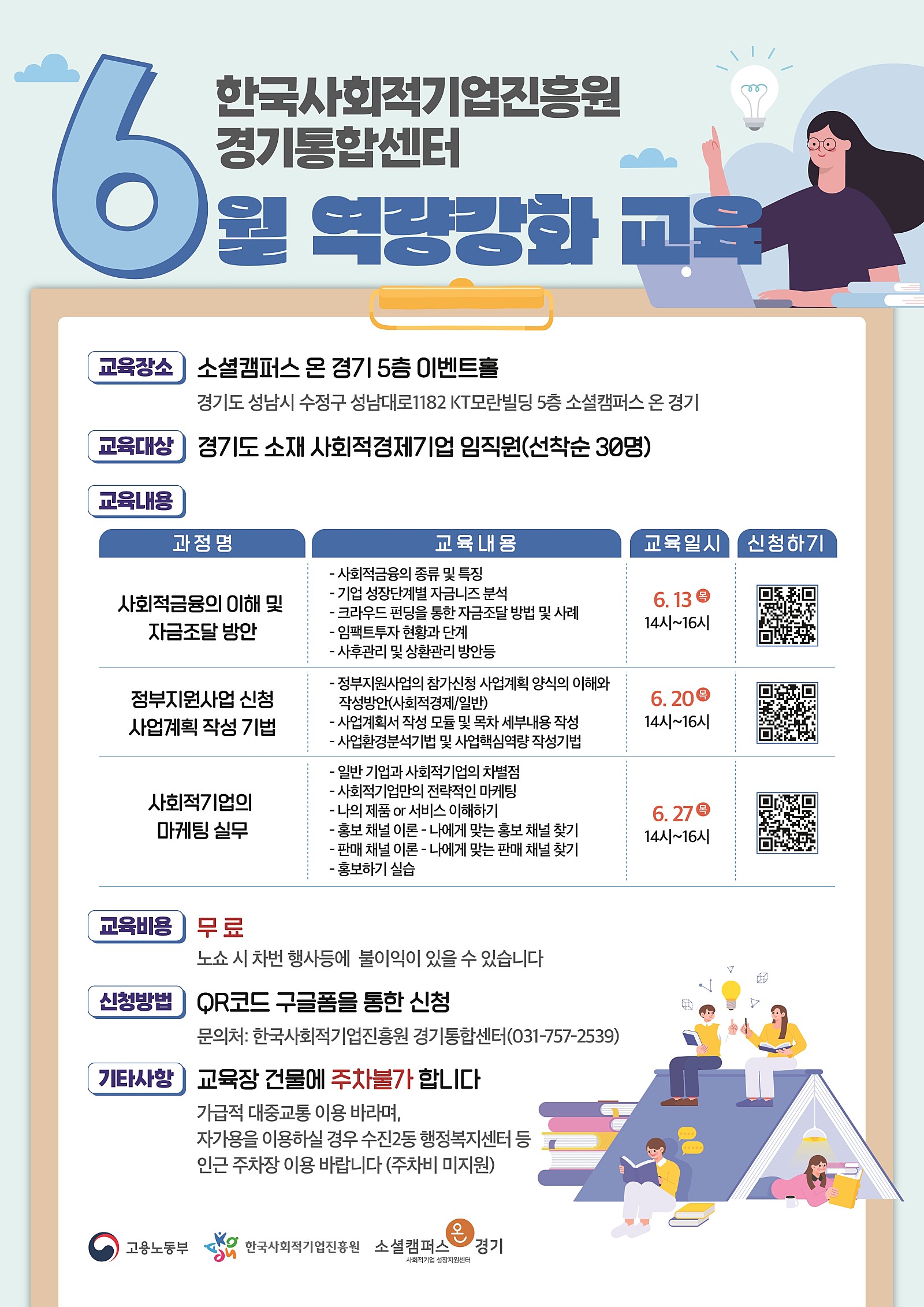 한국사회적기업진흥원 경기 성장지원센터에서 입주기업 및 경기도 사회적경제기업들의 역량강화를 위해 아래와 같이 6월 역량강화 교육을 진행하오니 많은 관심과 참여 바랍니다.