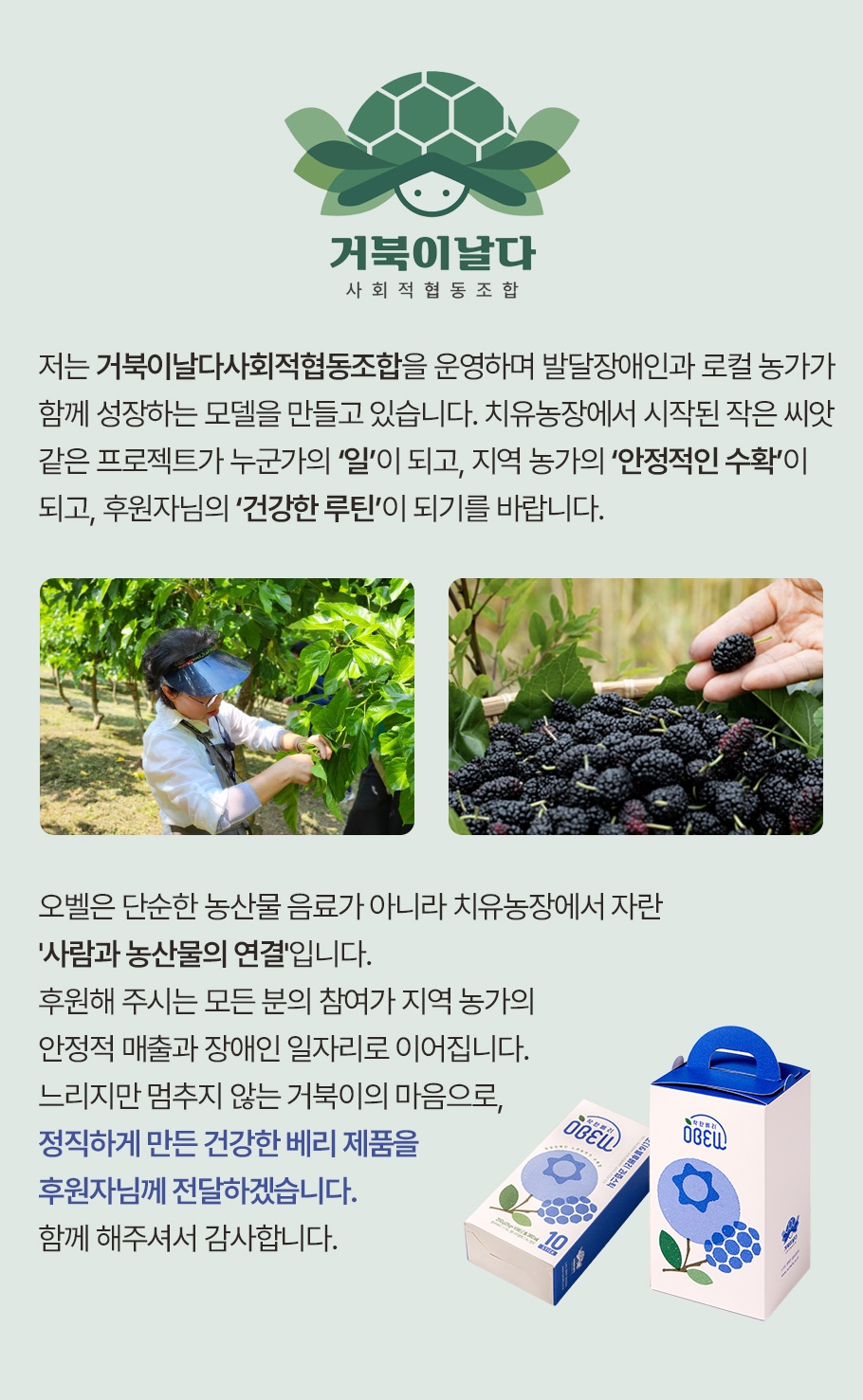 거북이날다사회적협동조합에서 오디와 블루베리를 배합하여 신제품인 오벨스틱을 출시하였습니다.