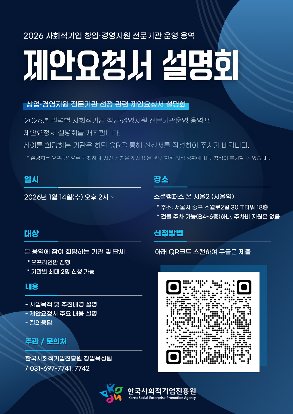 [한국사회적기업진흥원] 2026년 창업·경영지원 전문기관 운영 용역 제안요청서 설명회 개최 및 사전신청 안내