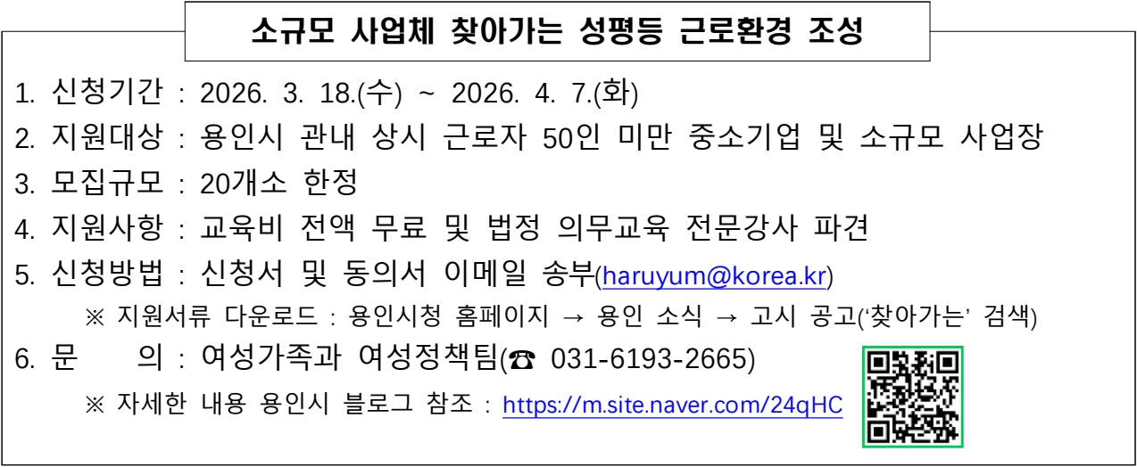 용인시 여성가족과에서 지원하는 <2026년 소규모 사업체 찾아가는 성평등 근로환경 조성 지원> 신청 안내를 전합니다. 매년 챙겨야 하는 직장 내 성희롱 예방교육 강사 섭외부터 비용까지 지원하는 사업이오니 사회적경제기업에는 놓치지 말고 활용해 보시기 바랍니다.