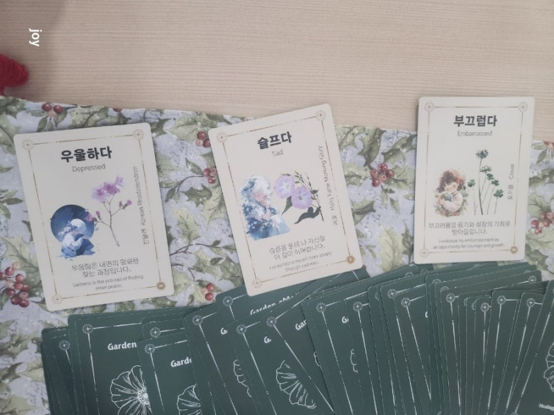저한테 이 셋 중 가장 힘든 감정이 무엇인지 확인하고 그 이유를 이야기 합니다, 그리고 그걸 어떻게 극복할 것인지 또 다른 감정카드를 보고 3장 정도 뽑습니다.